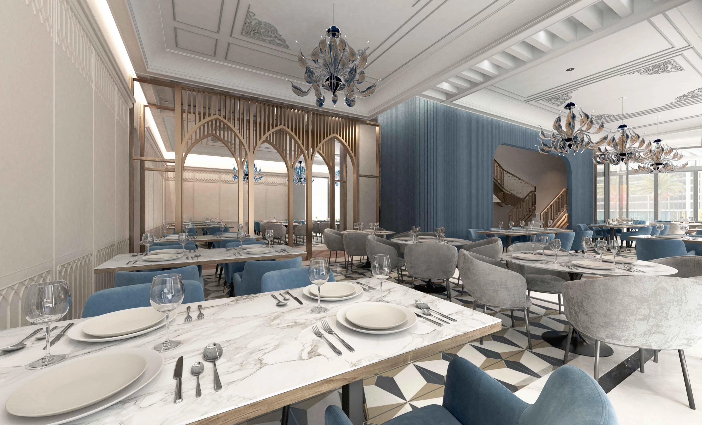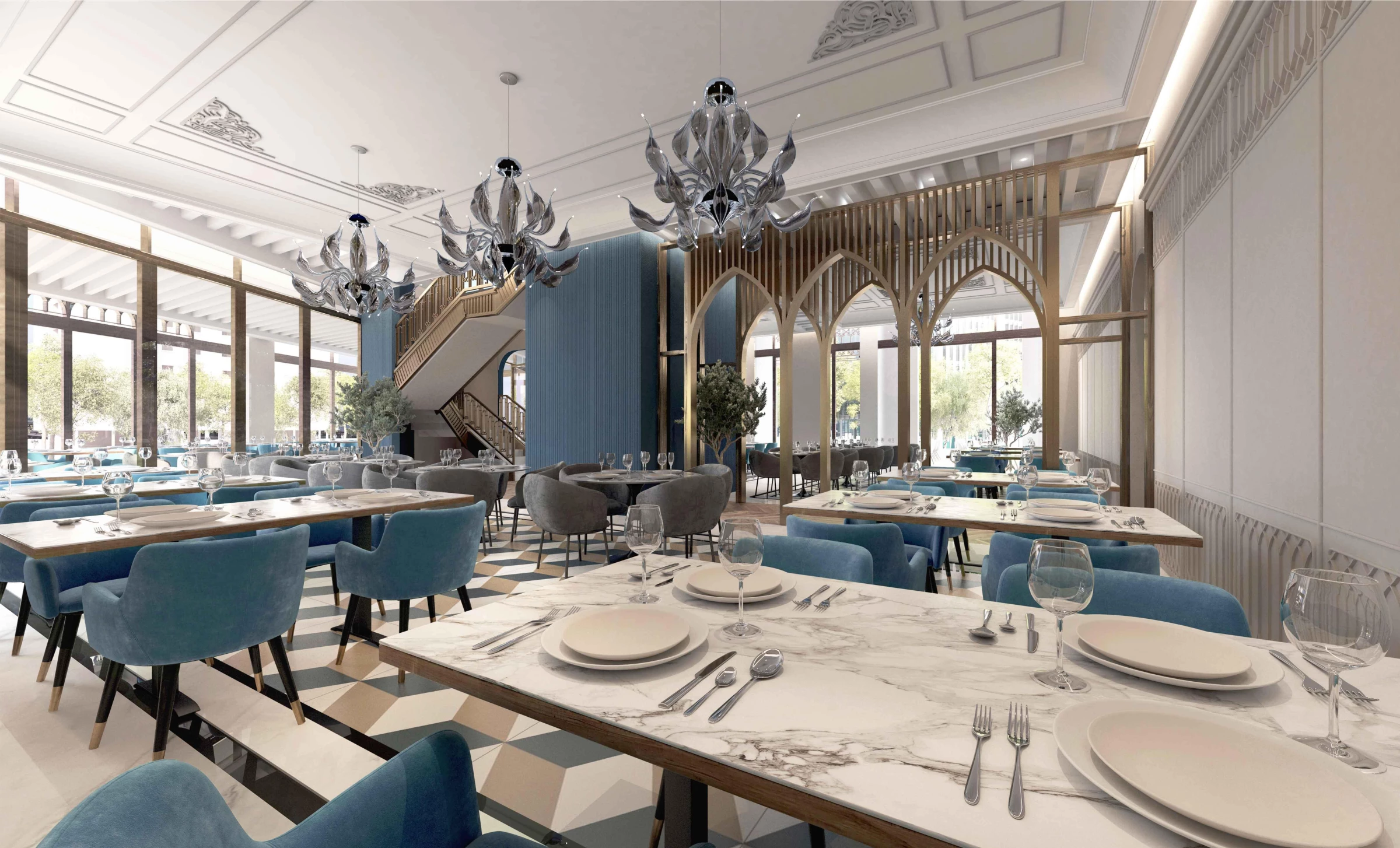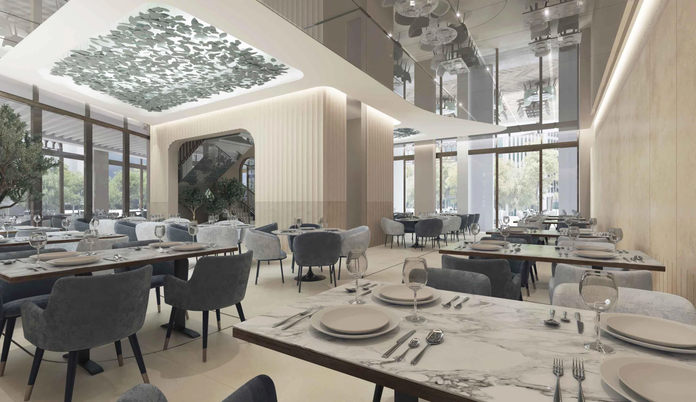 The interior is clad in large slabs of limestone in minimal joints, that wrap around a central courtyard clad in blue woodwork. The interior is envisioned like an interior garden with olive trees that wrap a stair leading to the upper floor. The ceiling is kept simple and covered with custom made glass light inspired by olive trees.