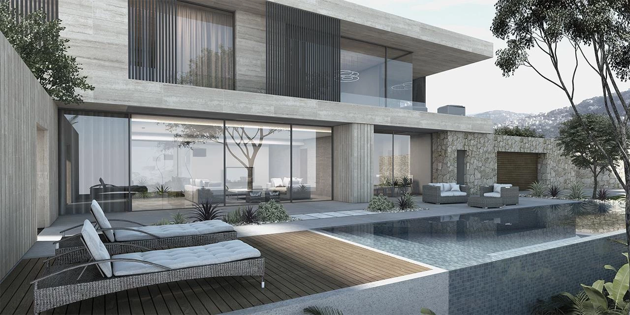 The first villa, the AA villa, is composed of three horizontal planes: One on the basement level, the second on the upper garden level, and the third on the roof level. These three planes are interrupted vertically by large walls or structural elements, and the rest of the facades were in glass.
