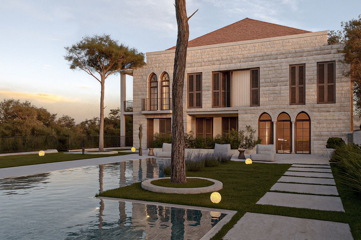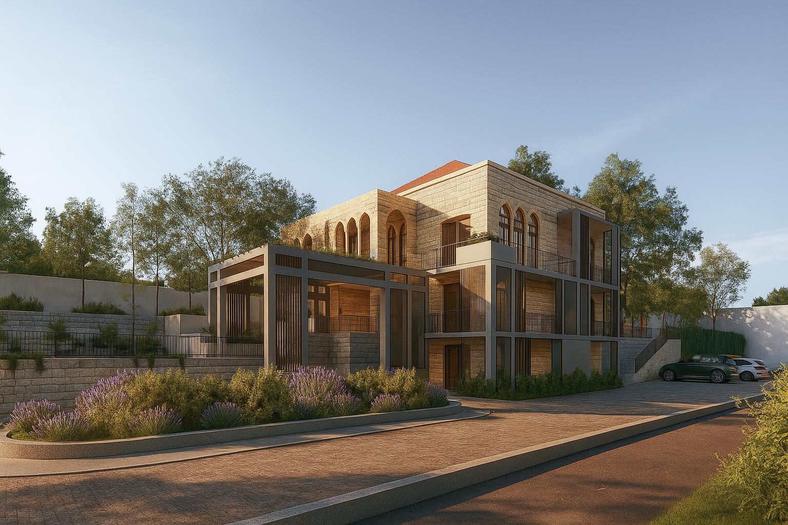 The blocks were finished in local quarry stone with the glazing cut and pushed deep inside the façade. The stone cladding took a parametric shape, with horizontal protruding stone fins that add shade and animation to the solid facades.
