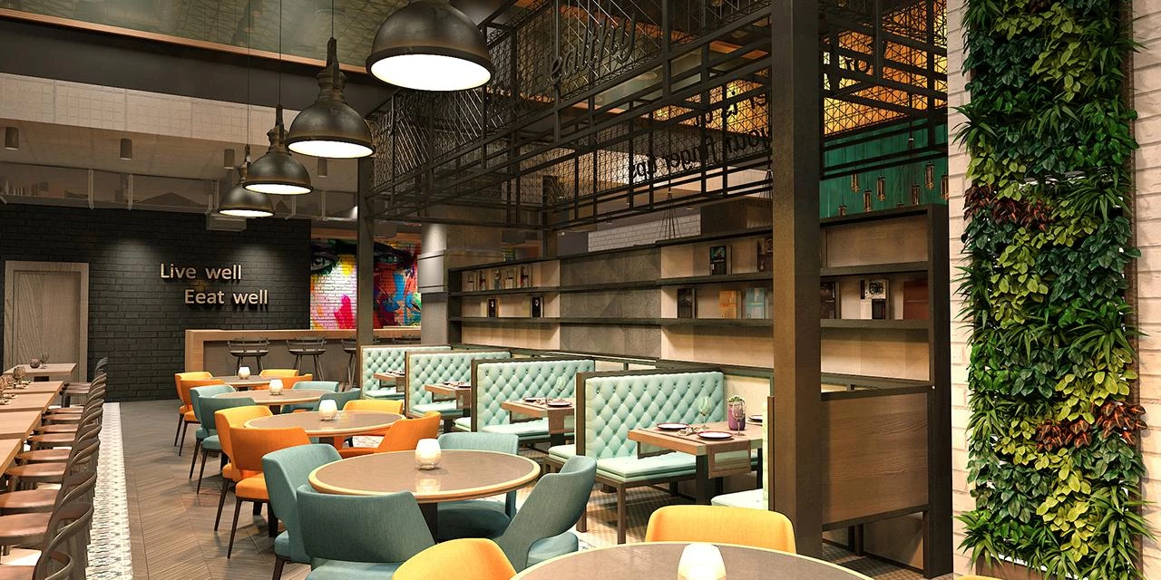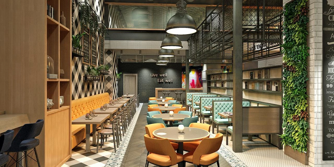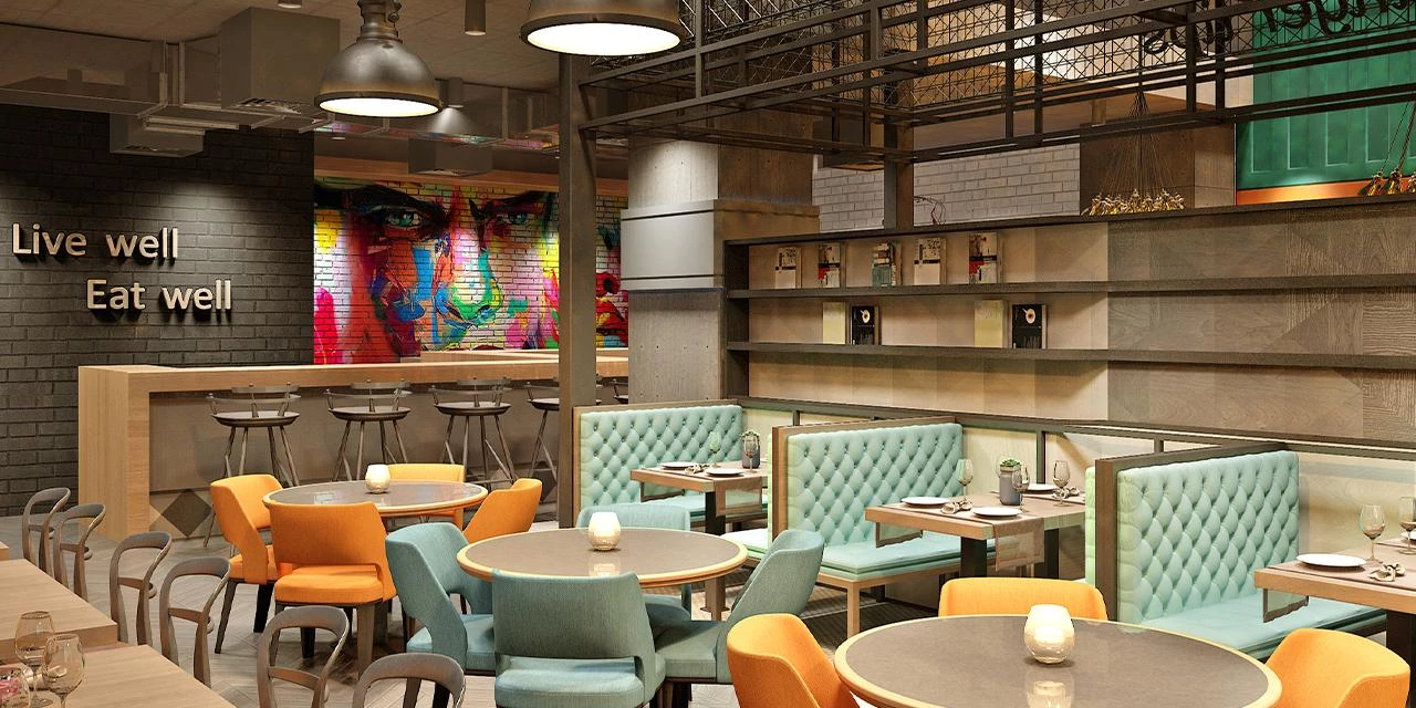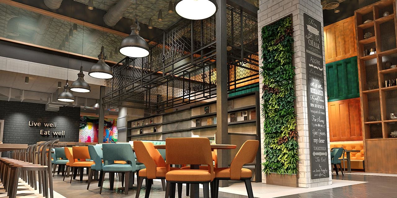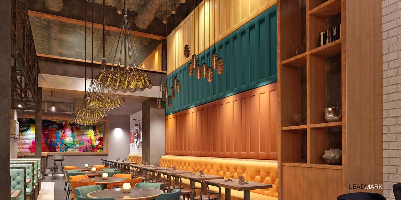 The Manhattan Restaurant was a proposal to build a new fast food brand offering a mixed international menu, and directed toward a younger generation. The brand guidelines required a highly detailed cozy looking interior with striking forms and a highly dynamic appearance.