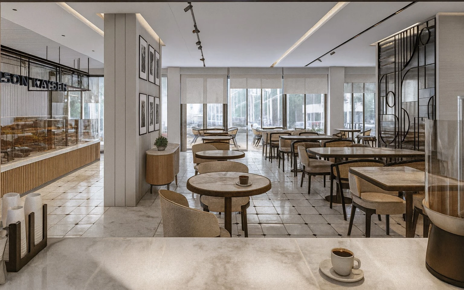 The previous seating area was preserved but re configured in a new seating layout to allow a more vibrant interior, and easier circulation. The bar size was enlarged and unified, and kept in simple marble finish as per the Eric Kayser brand guidelines.