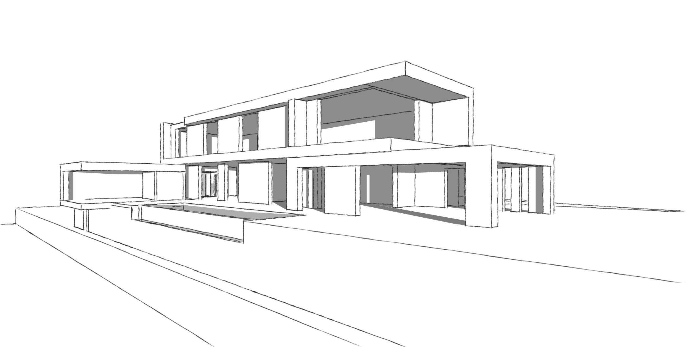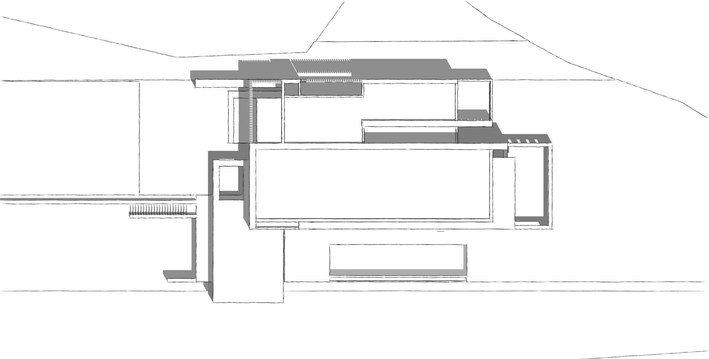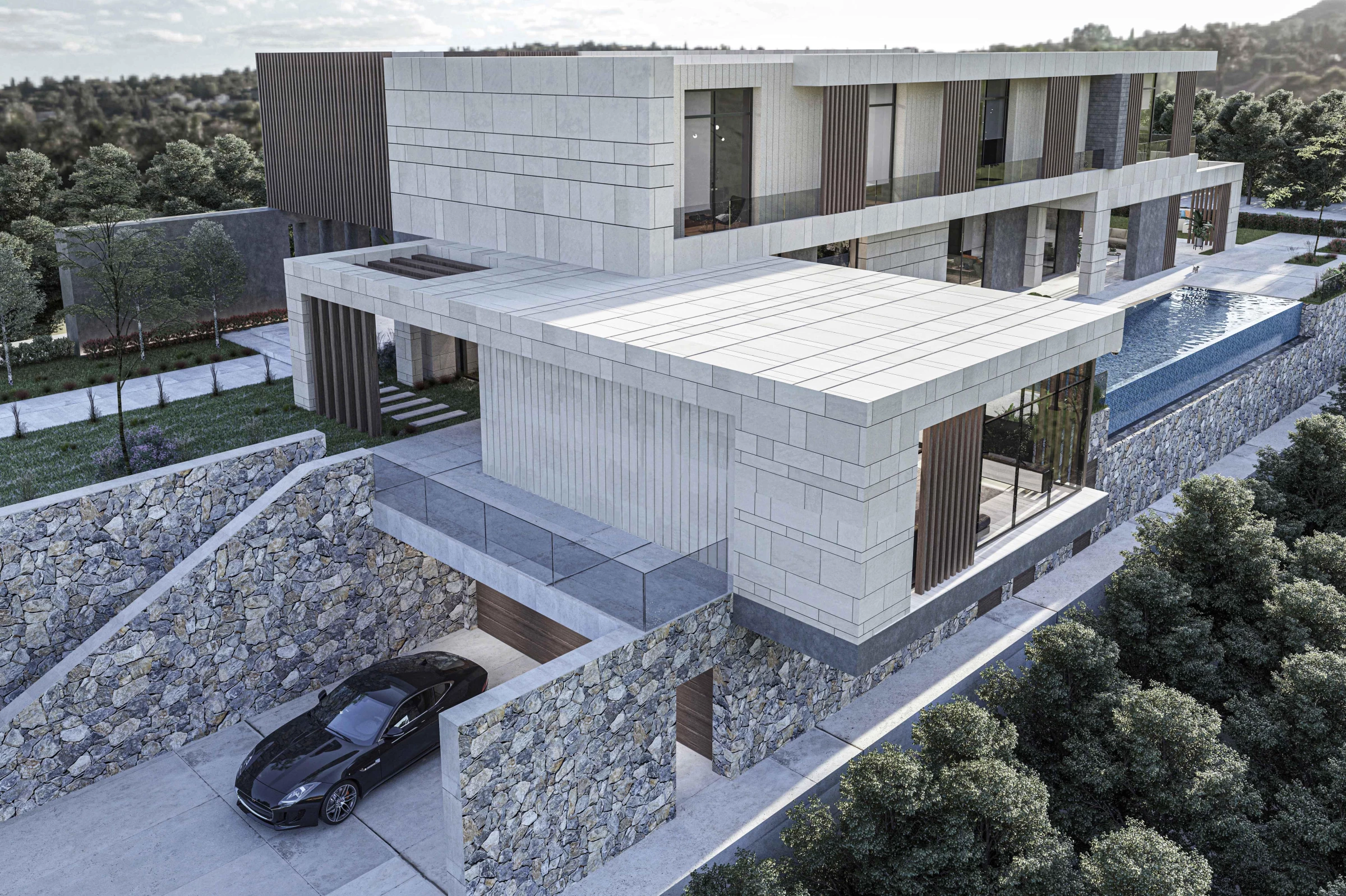 Our response to the project condition was to create a linear horizontal series of slabs that float over the cliff side, and reduce the site verticality. The slabs twist to the entrance side to provide additional privacy, while they are kept floating to the cliff side to maximize views.
