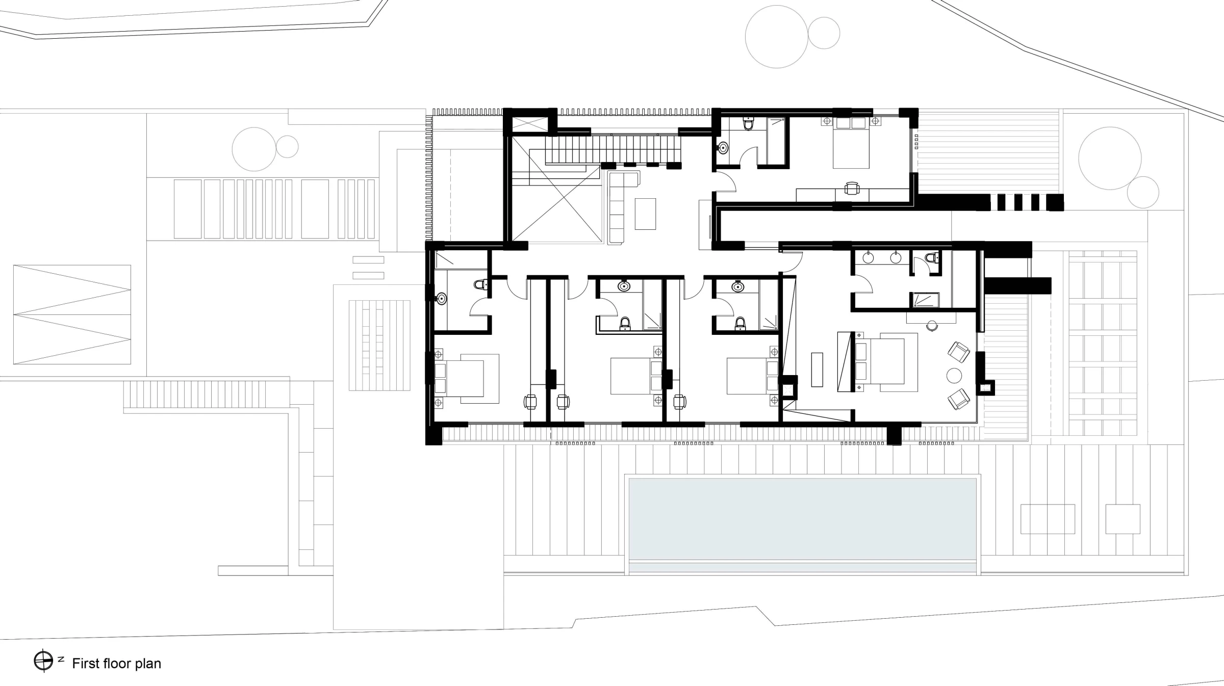 The site of the HK Villa is a very steep mountain that was cut into a series of horizontal narrow and long platforms with a visible cliff side that are almost vertical and exceed 15 meters in some locations. The challenge was to provide a large estate with various indoor and outdoor facilities on a very tight site, and still offering a relaxed and modern environment inside.