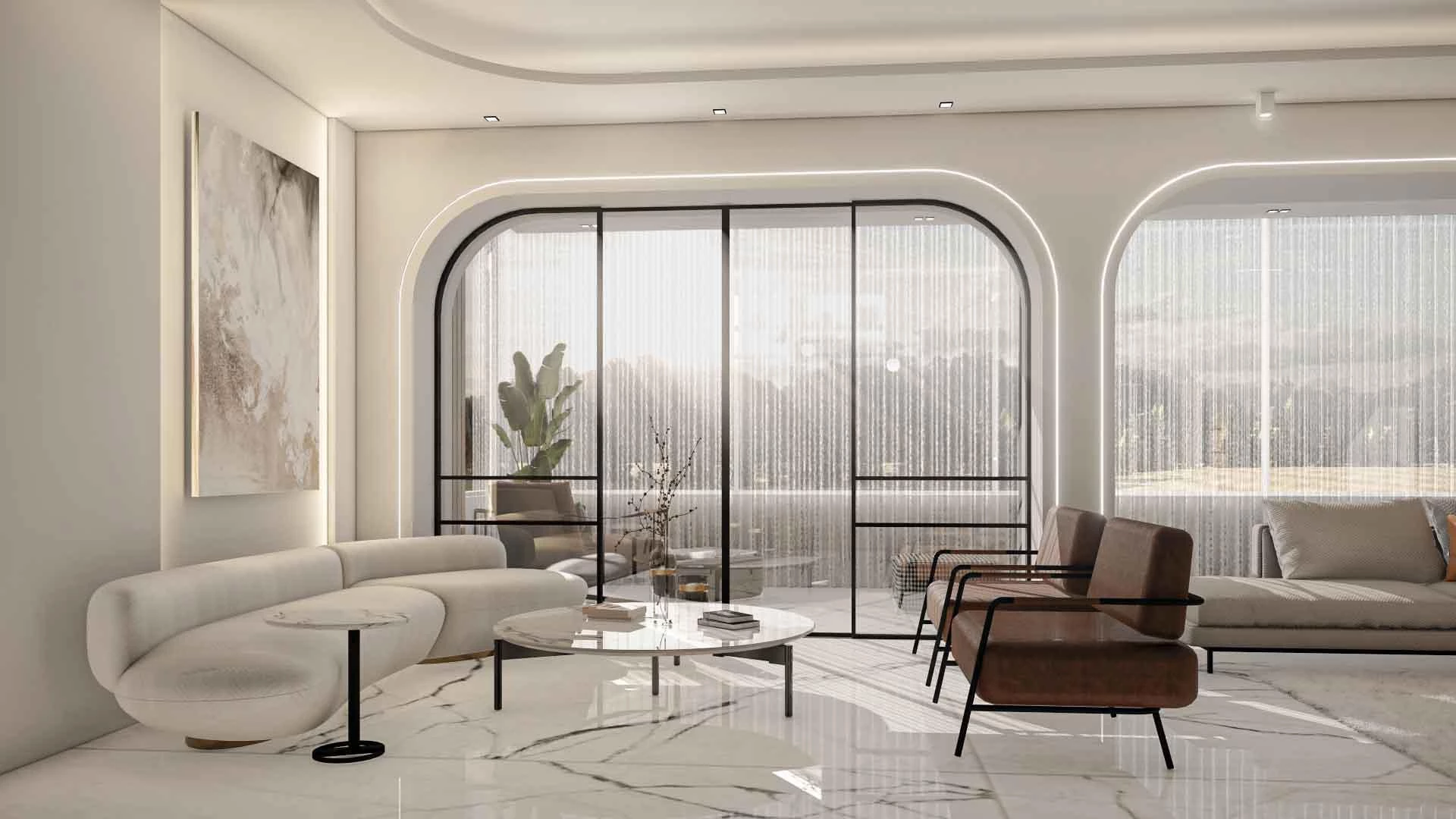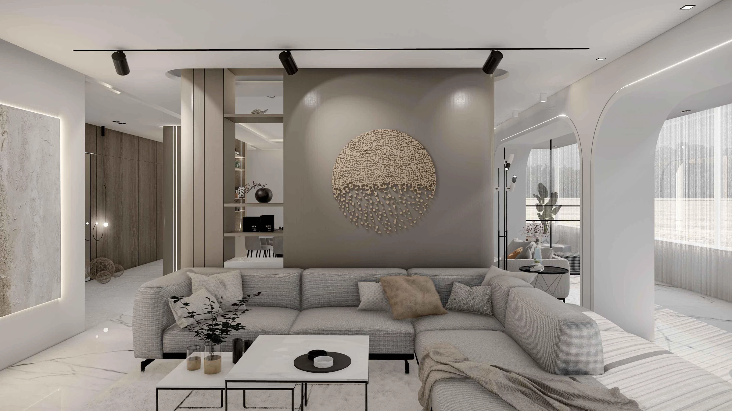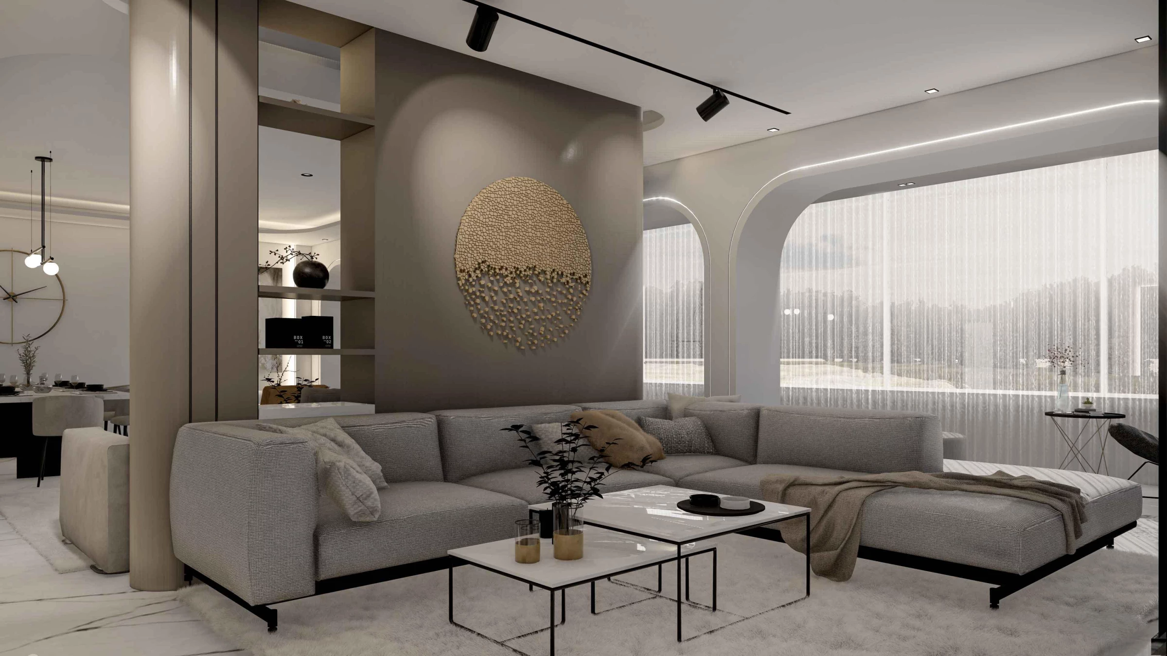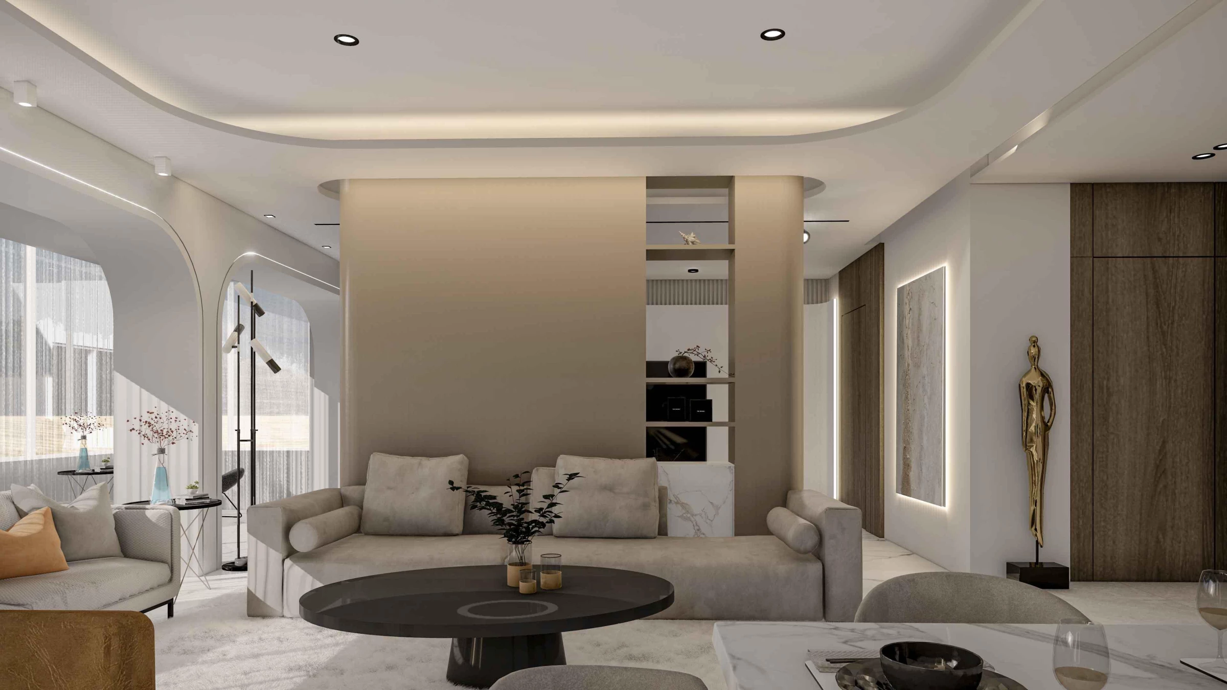 The interior design of the apartment used French interior hues, incorporating rounded arches and corners that are both decorative, and help to eliminate any sharp corners to give a sense of a larger space and continuity. The ceiling were deigned in curved lines as well to compliment and reflect the interior wall treatment.
